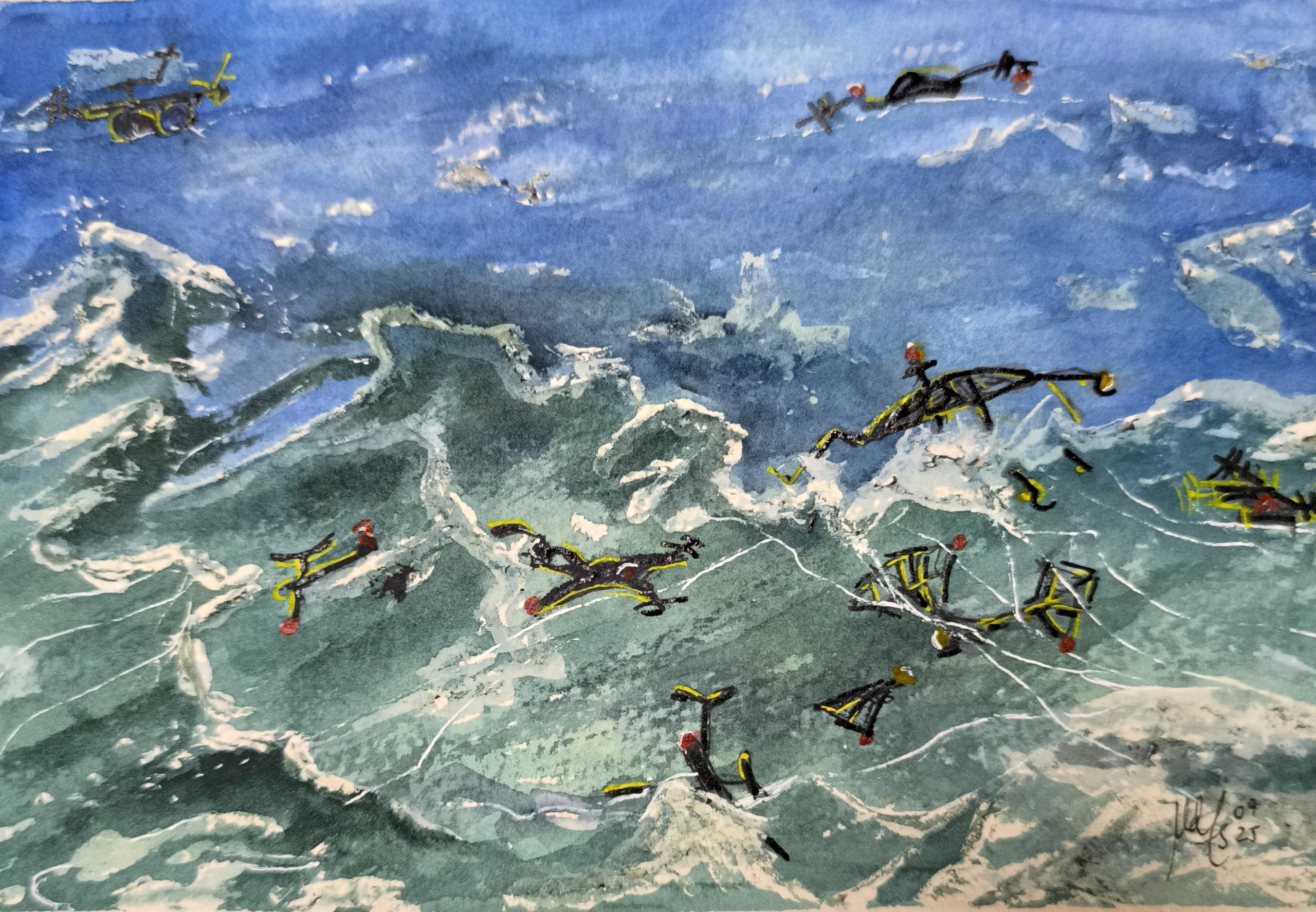 Valentina ha bajado a la playa temprano. Las máquinas se acaban de retirar. La arena brilla. El azul luminoso de Mediterráneo se extiende hasta el infinito y más allá. Está sola. Se acerca a la orilla y comienza a susurrarle al mar: «Mediterráneo, escucha, tú también llegas a una orilla lejos de aquí. En aquellas playas no hay sombrillas ni toallas, allí caen bombas, drones y misiles. ¿No podrías eliminarlos, desactivarlos con tu fuerza?»