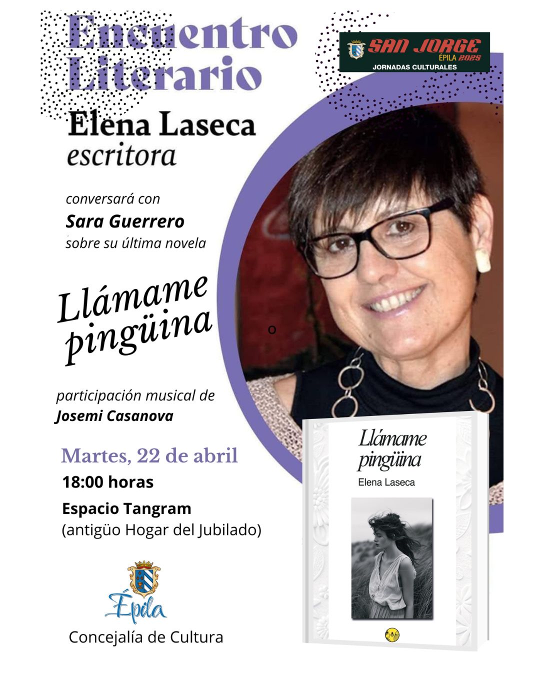 Hay días en los que la magia sucede, y el martes 22 de abril en Épila fue uno de ellos. En el bellísimo Espacio Tangram —que además se estrenaba como lugar de encuentro literario— vivimos una tarde de emociones, música y palabras en torno a mi novela Llámame pingüina. El acto se celebró en el marco de las Jornadas Culturales en honor al Día de San Jorge.